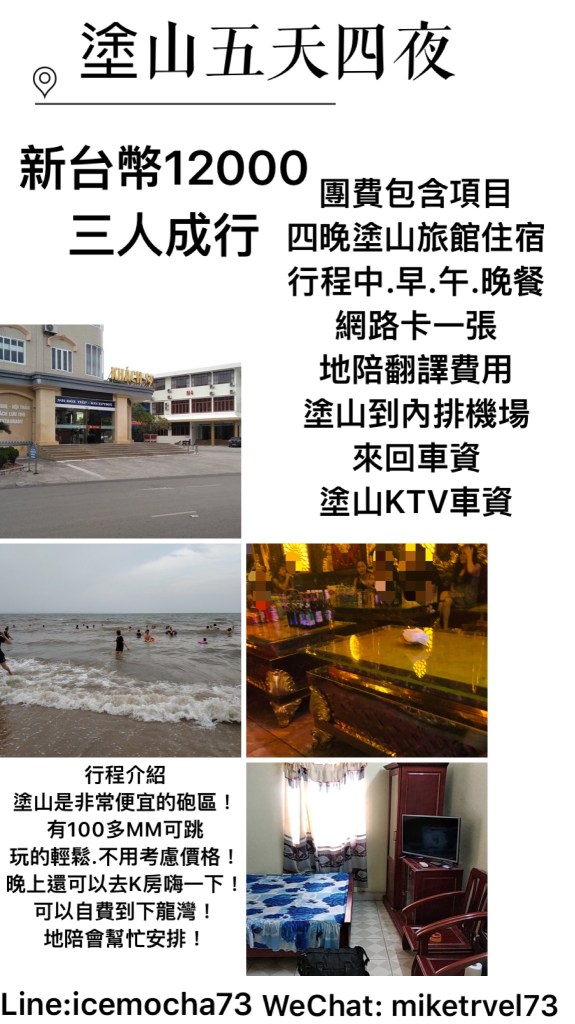 1DAY–飛往河內內排機場,安排專車接機,接完機後前往塗山,車程約2.5小時,抵達塗山後安排換匯,房間!準備上陣!晚上安排妹子過夜