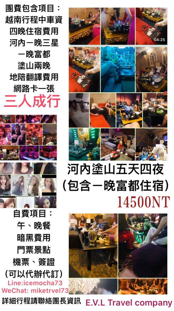 本行程跟純塗山不同,這行程會吧北越最便宜到最貴都各玩一遍,體驗一下北越最高檔夜總會富都!自費部分也會相對比塗山高多!